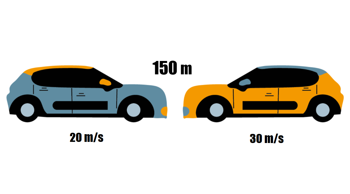 To biler med en afstand på 150 meter kører mod hinanden. Den ene bil kører 20 m/s og den anden bil kører 30 m/s. Hvor mange sekunder går der, før de to biler støder sammen?